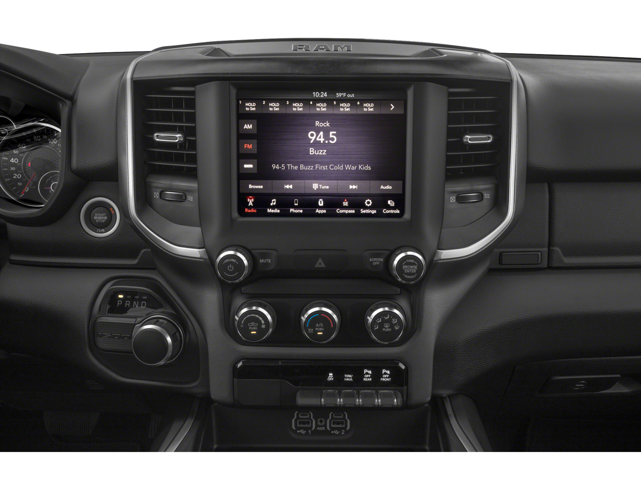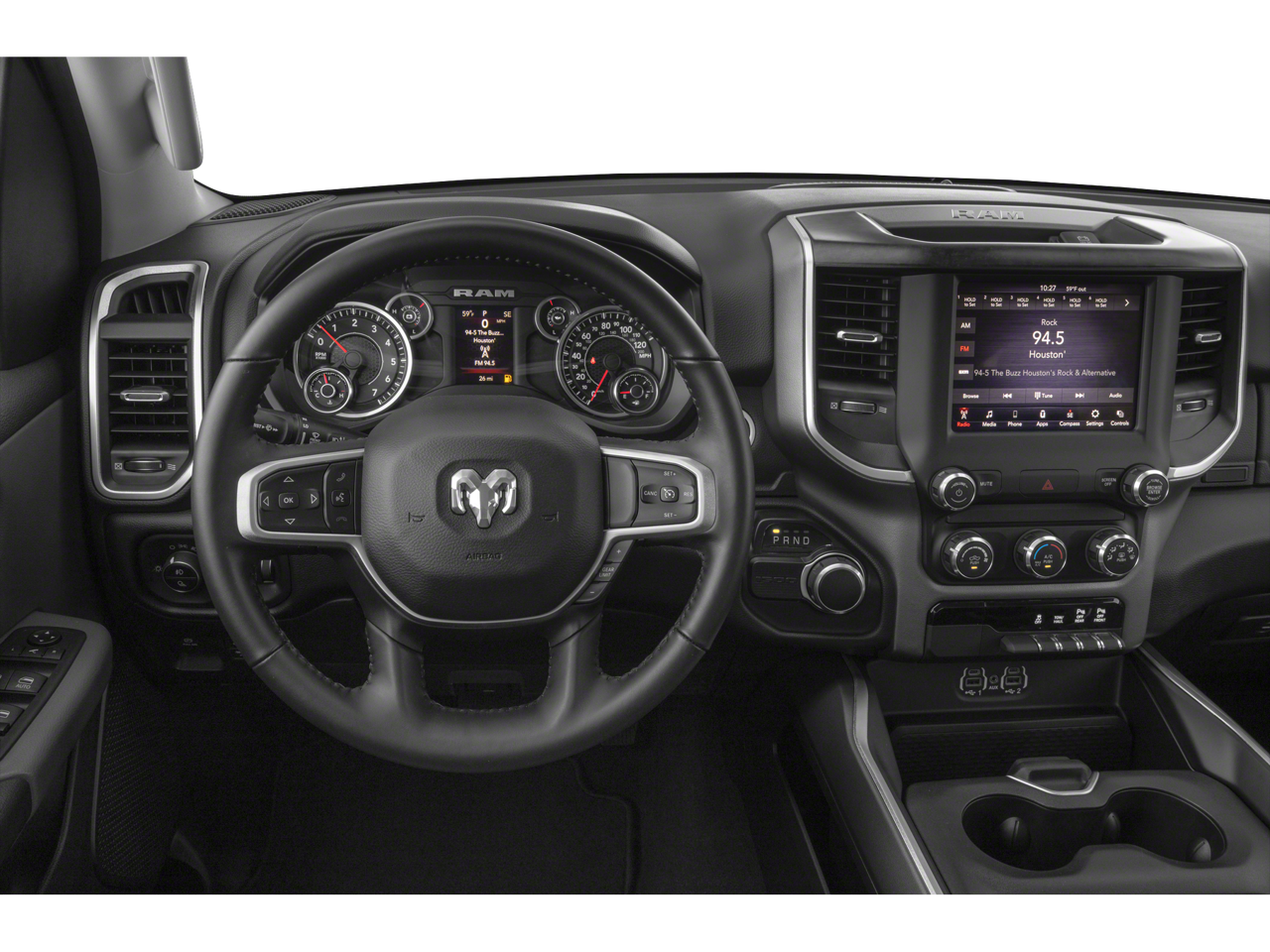 Storage is a primary focus in the Big Horn trim. The interior includes 2nd Row In Floor Storage Bins, which are perfect for tucking away tools, emergency kits, or beach towels. The Front Center Armrest w/Storage and Front Seat Back Map Pockets provide plenty of room for smaller items. For added convenience, the Rear Power Sliding Window and Power second-row windows allow for excellent airflow, while the 115V Auxiliary Power Outlet and 400W Inverter mean you can power larger electronics or tools directly from the cabin. The Remote Start System is a true lifesaver, allowing you to cool down the interior before you even step outside your home in Orange Park.